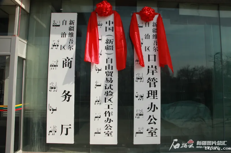 ▲2024年3月22日,“中国(新疆)自由贸易试验区工作办公室”“新疆维吾尔自治区口岸管理办公室”同时揭牌成立。(图片来源:新疆日报)