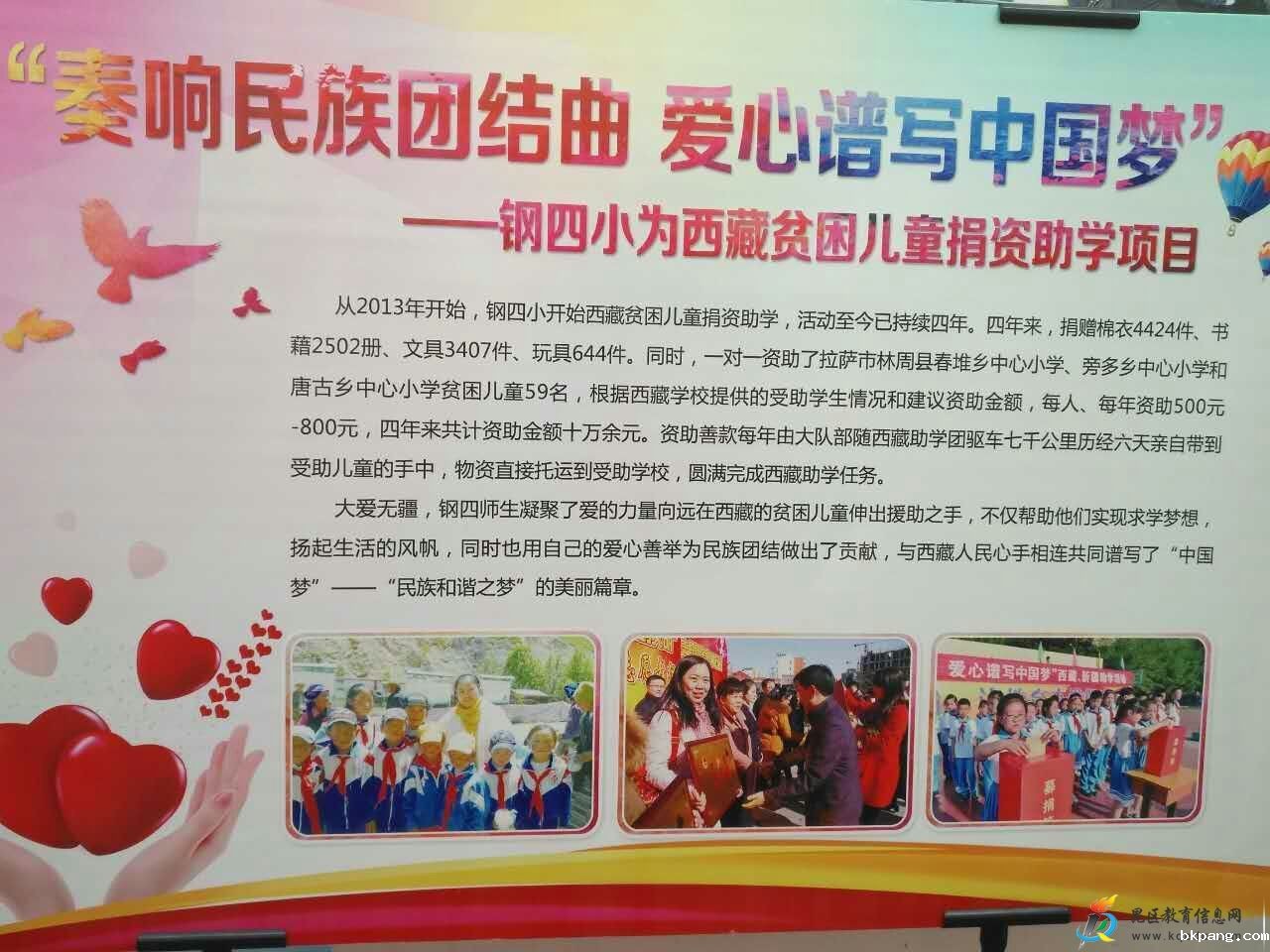 大爱无疆,钢四师生凝聚了爱的力量向远在西藏的贫困儿童伸出援助之手,不仅帮助他们实现求学梦想,扬起生活的风帆,同时也用自己的爱心善举为民族团结做出了贡献,与西藏人民心手相连共同谱写了“中国梦”——“民族和谐之梦”的美丽篇章。