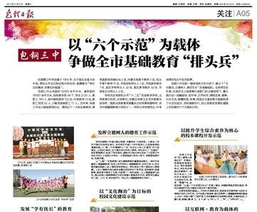 2017年3月8日,包头日报A05版以《包钢三中以 "六个示范" 为载体 争做全市基础教育 "排头兵" 》为题进行了整版报道。昆区教育信息网、昆都仑教育微信公众平台原文转载,读者可阅读本期包头日报,或上包头新闻网查阅。